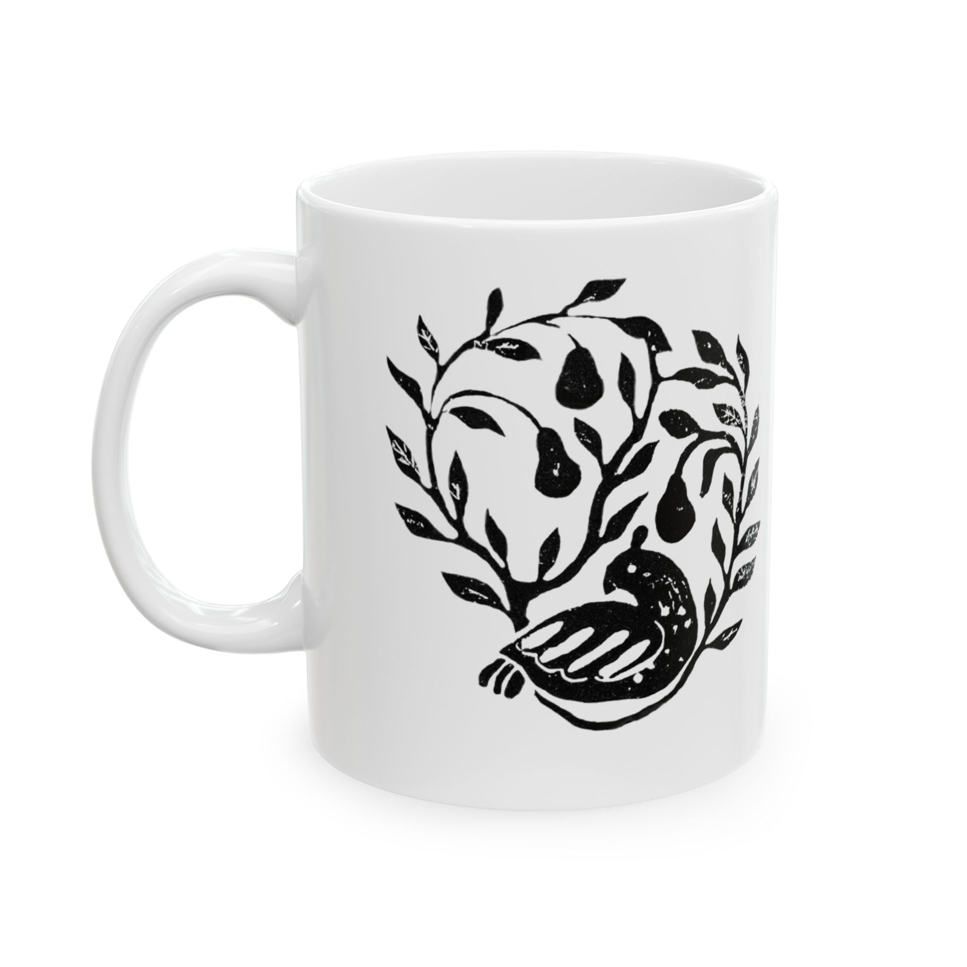 Wrapped in the classic HW partridge stamped print, this ceramic mug brings quiet mornings into focus. The monochrome bird and leaf motif has a meditative, folk-art feel — simple lines that invite slow sips and small rituals. It is a perfect accompaniment to the table. A great mug to sip from and map out a day, journal a thought, or share a cozy conversation. The subtle pattern is both modern and timeless, slipping easily into a minimal kitchen or an artsy studio shelf. Use it for coffee, tea, or a calming cocoa.